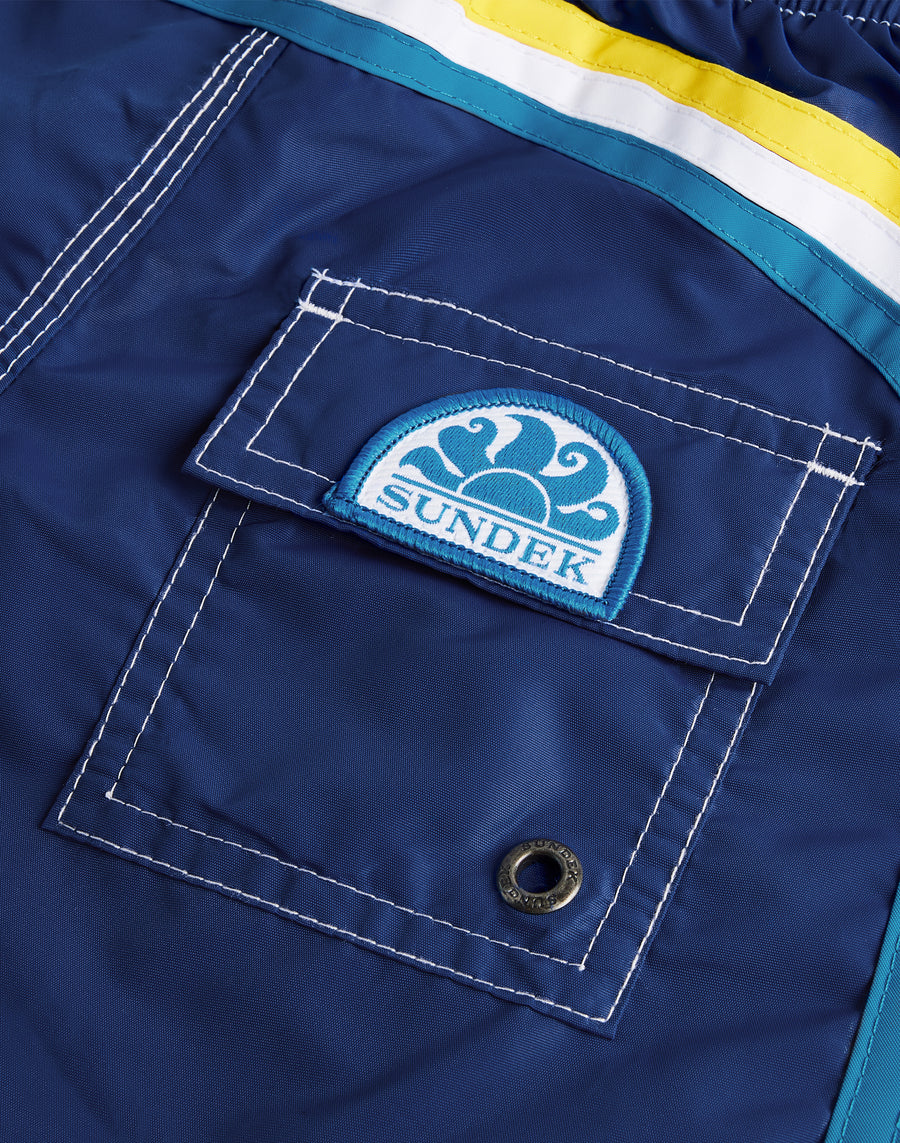 Couleur intense et matière hyper confortable à séchage rapide pour ce short de bain garçon. Un modèle qui accompagnera votre enfant dans ses mille activités de vacances, parfait pour bouger et jouer en toute liberté. il est fabriqué à partir de notre tissu en taffetas de nylon héritage et construit avec des coutures à trois aiguilles qui le rendent durable dans le temps. À ranger dans sa valise, année après année.