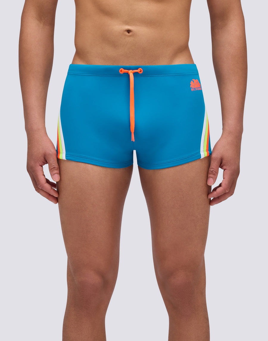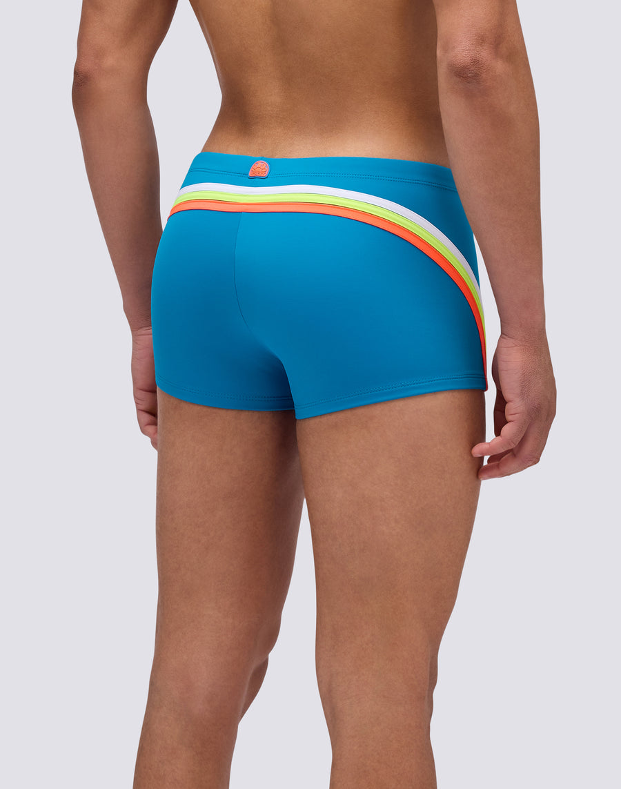 Boxer de bain pour homme à taille ajustable avec cordon de serrage et cordon de serrage contrasté : c'est un modèle intemporel en phase avec son temps car il est éco-durable grâce au tissu régénéré ECONYL® Made in Italy. Vous pouvez le porter aussi bien pour nager que pour bronzer et bronzer. Longueur de jambe extérieure 9"/23cm (en taille M).