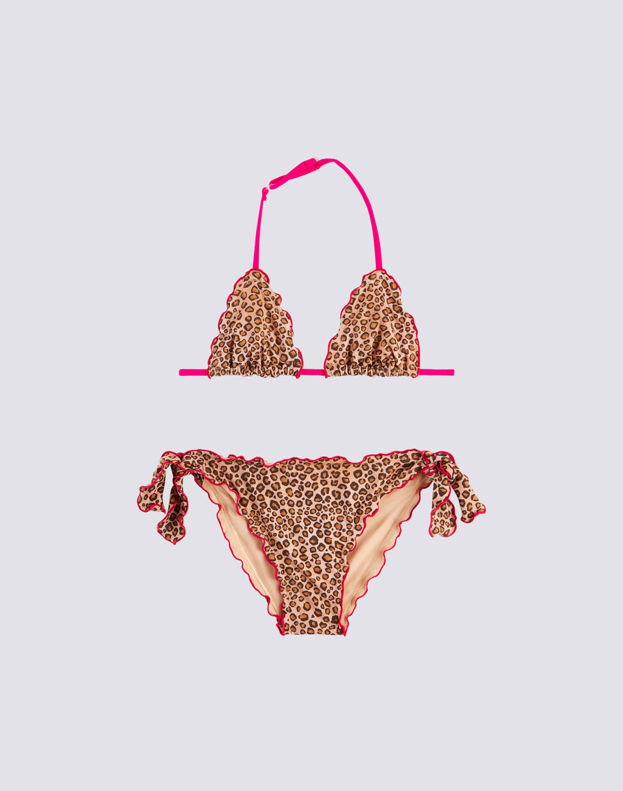 Bikini fille composé d'un haut triangle à bretelles réglables et d'une culotte à nœuds également réglables. L'imprimé Leorock de style tacheté est le protagoniste. A porter si besoin coordonné avec le même modèle en taille femme.