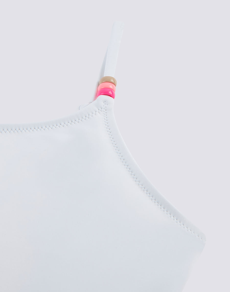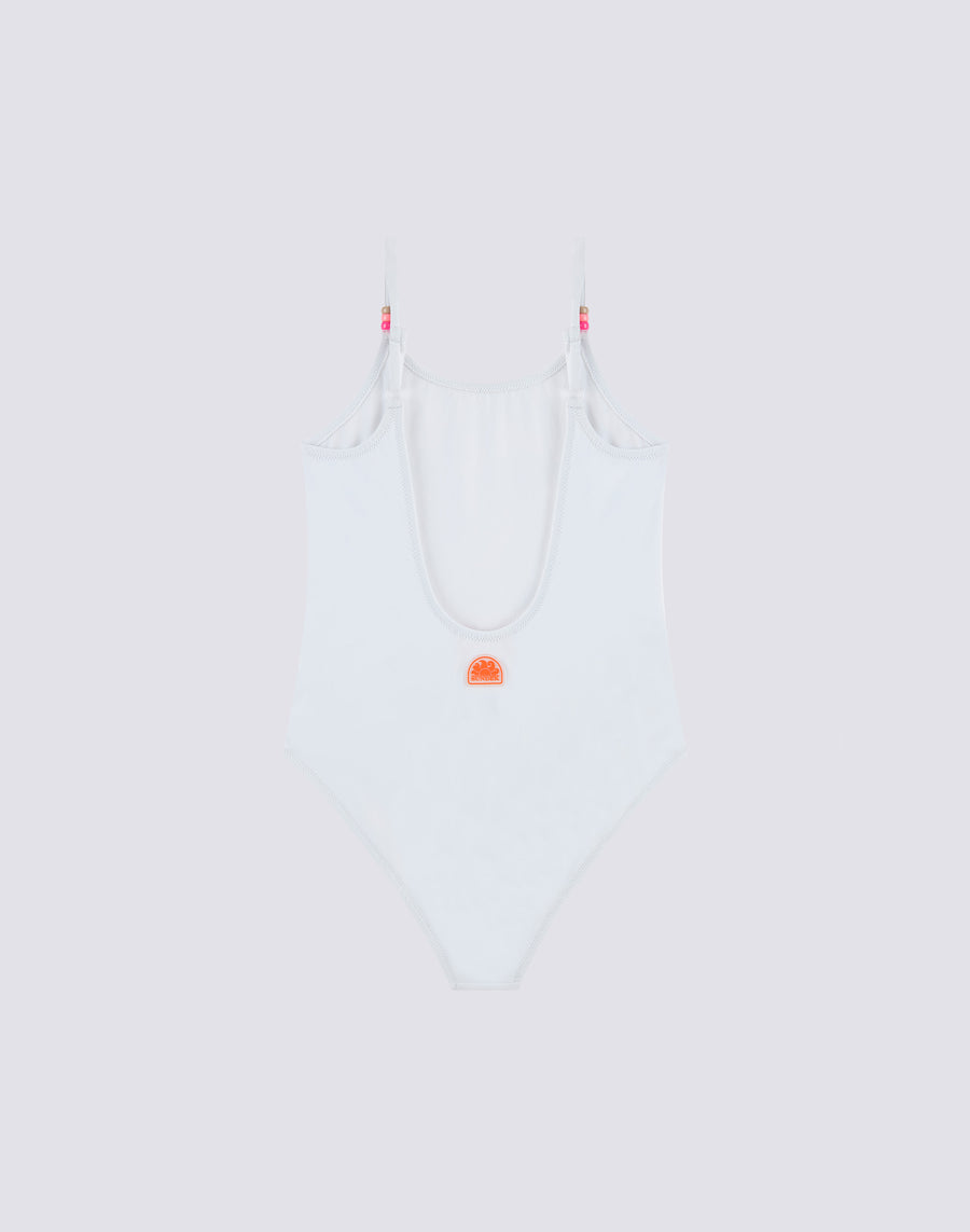 Maillot de bain une pièce avec décolleté profond dans le dos, fines bretelles avec perles tricolores.