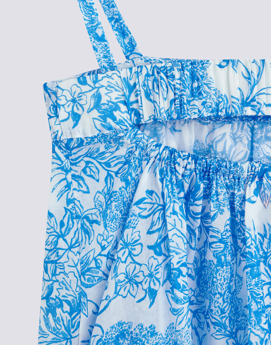 Robe courte sans manches pour fille avec élégant imprimé Fleur de Joie. Avec des bretelles élastiques et froncables et un lien dans le dos, c'est le vêtement idéal à porter pour les occasions spéciales.