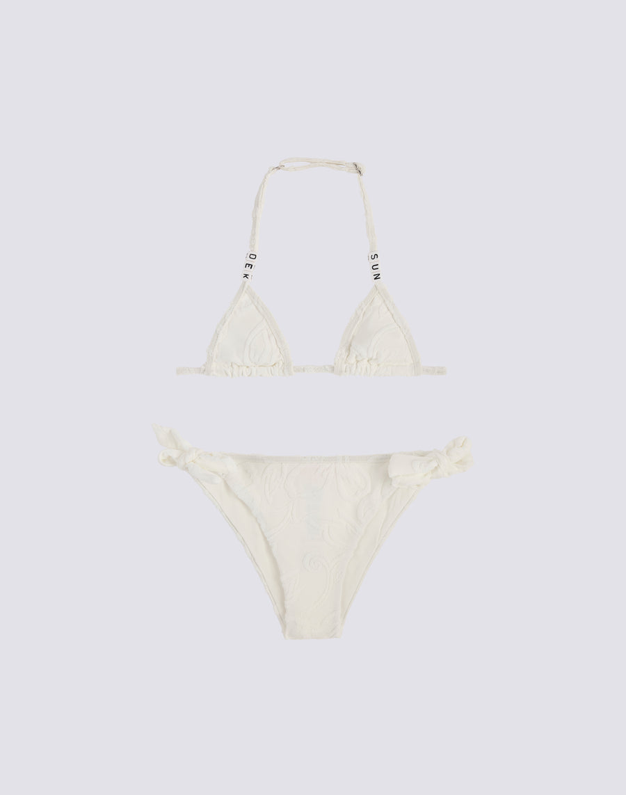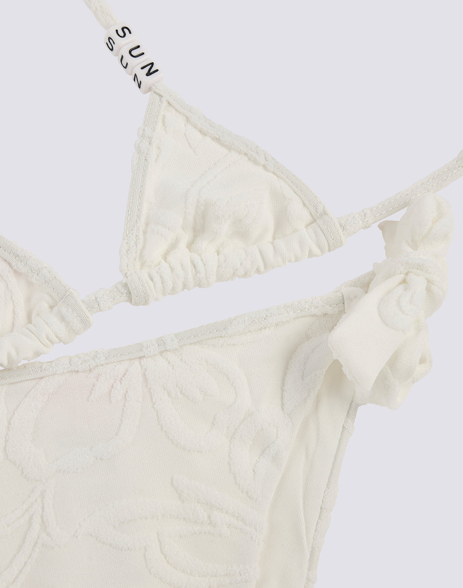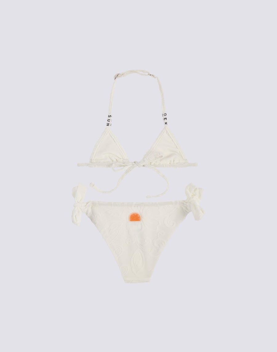 Mini bikini en jacquard éponge avec motif SK23 composé d'un triangle avec attaches réglables et d'une culotte avec nœuds, également réglable.