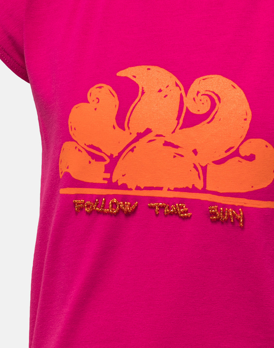 Un t-shirt amusant et polyvalent à porter tout l'été avec de nombreux vêtements différents : sans manches, une coupe courte, un nœud central et une inscription centrale du logo Sundek brodé en perles.