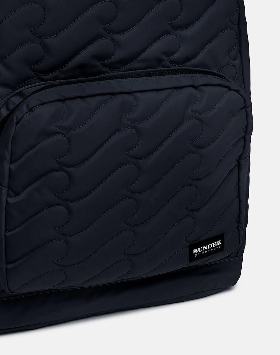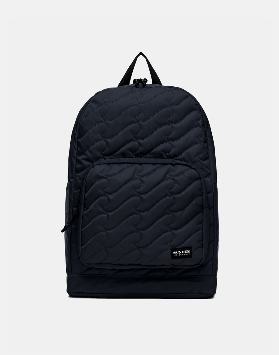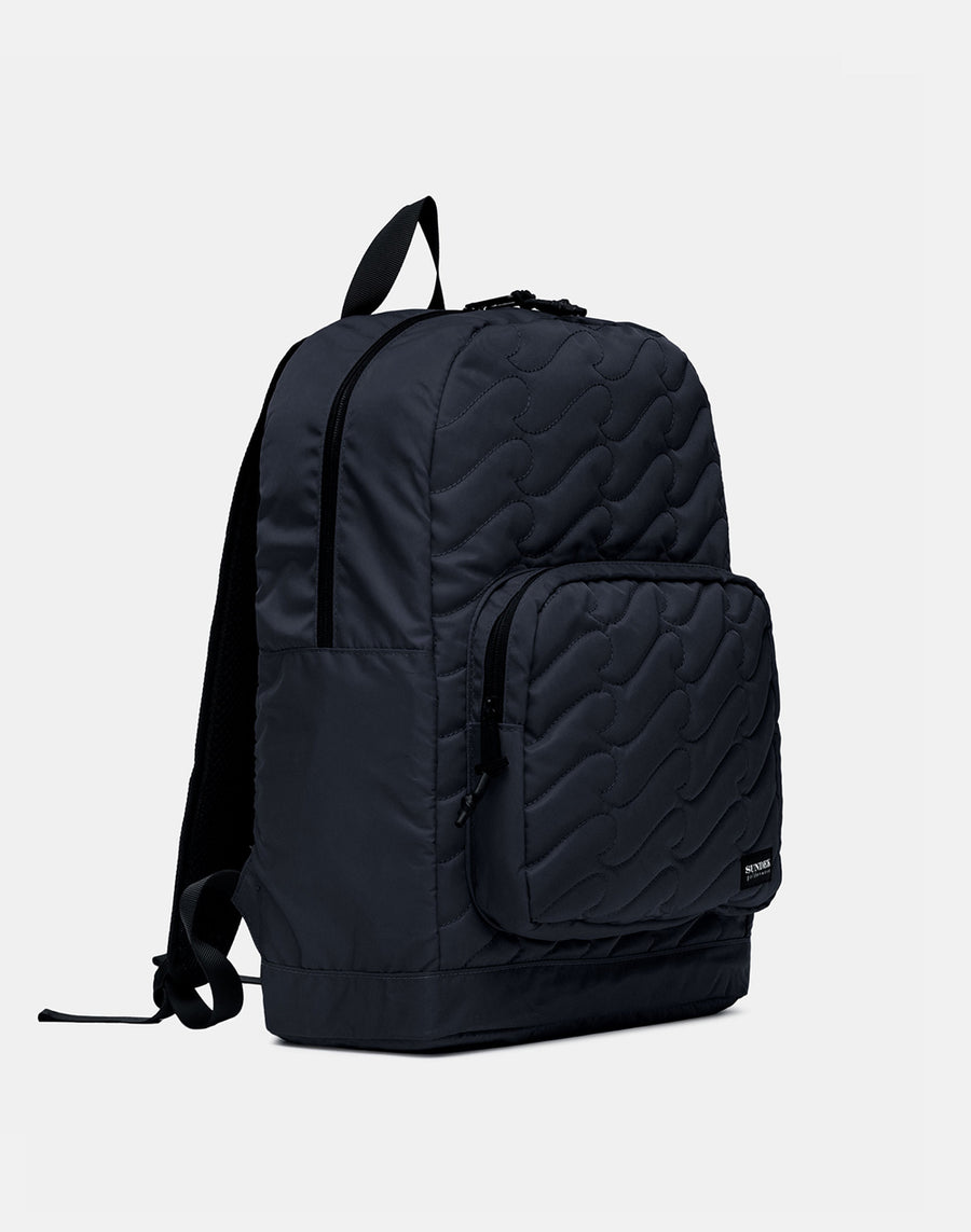 Sac à dos rembourré avec couture ondulée caractéristique et poche intérieure pour ordinateur portable.