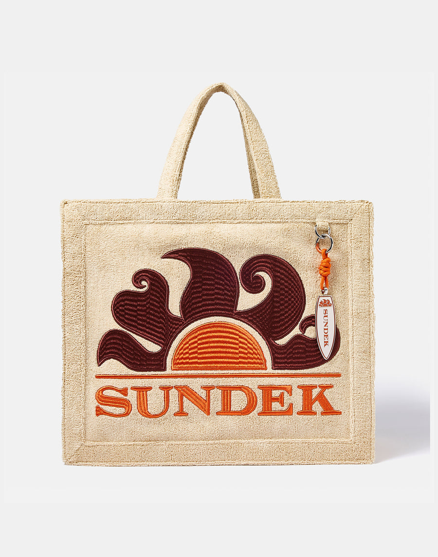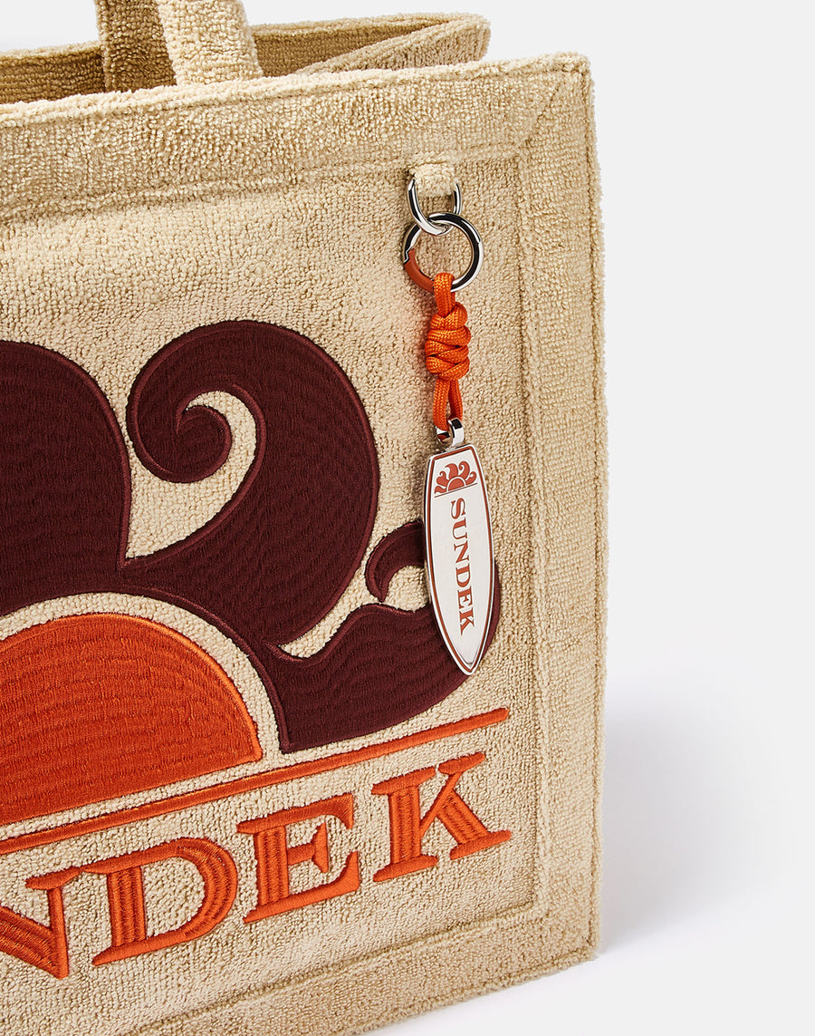 Sac à main de plage en éponge avec logo brodé. Charm avec la forme caractéristique d'une planche de surf