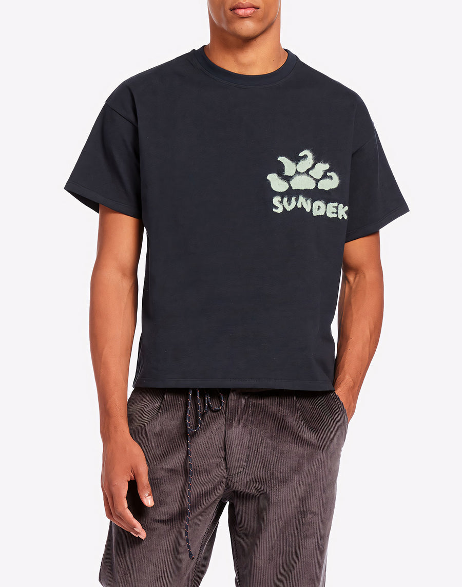 Un t-shirt oversize à col rond, à porter où et quand on le souhaite, à la ville ou en voyage. Logo en laine cousu main sur la poitrine.
