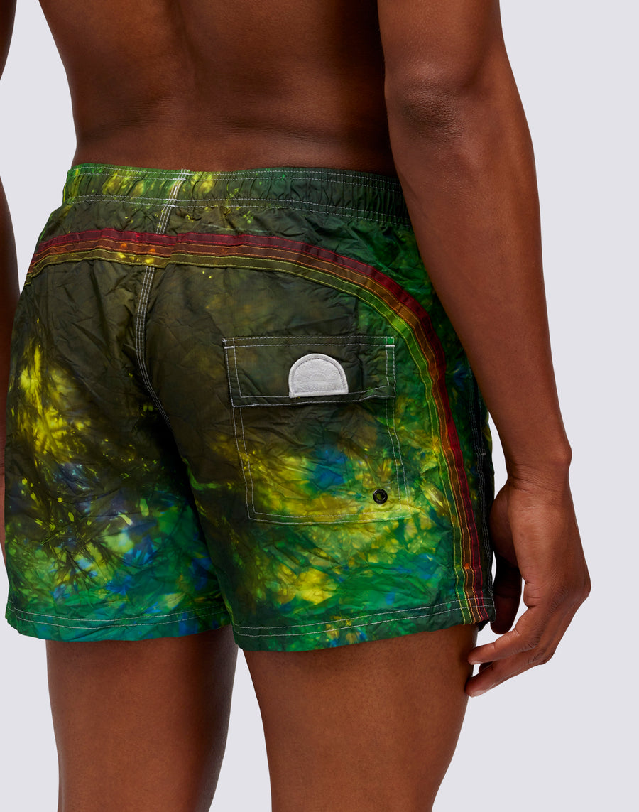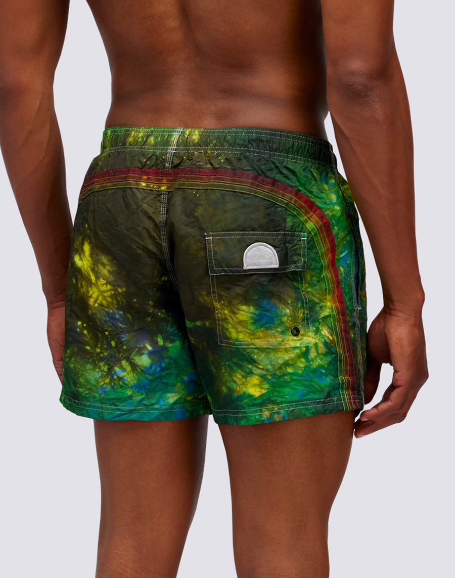 Préparez-vous à surfer sur la prochaine vague avec ce maillot de bain court à taille élastiquée au travail spécial batik, traité et teint selon des techniques artisanales. Le tissu en taffetas de nylon et la construction à motifs le rendent à séchage rapide et extrêmement durable saison après saison.