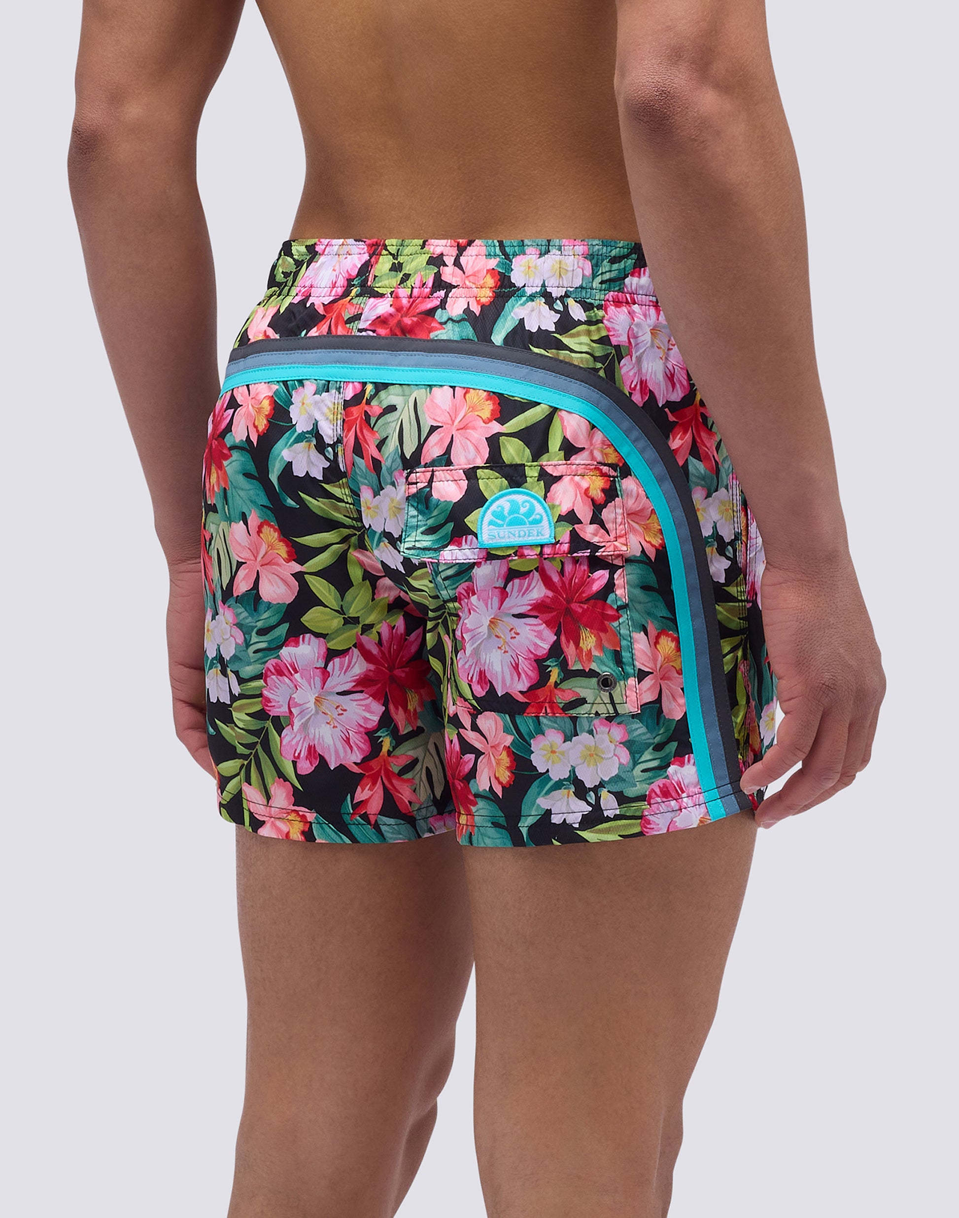Costume da bagno a pantaloncino da uomo in tessuto Poliestere leggero, dall'asciugatura rapida. Dettaglio iconico arcobaleno Sundek sul back e stampa. Lunghezza esterno coscia 14”/35 CM (in taglia M).