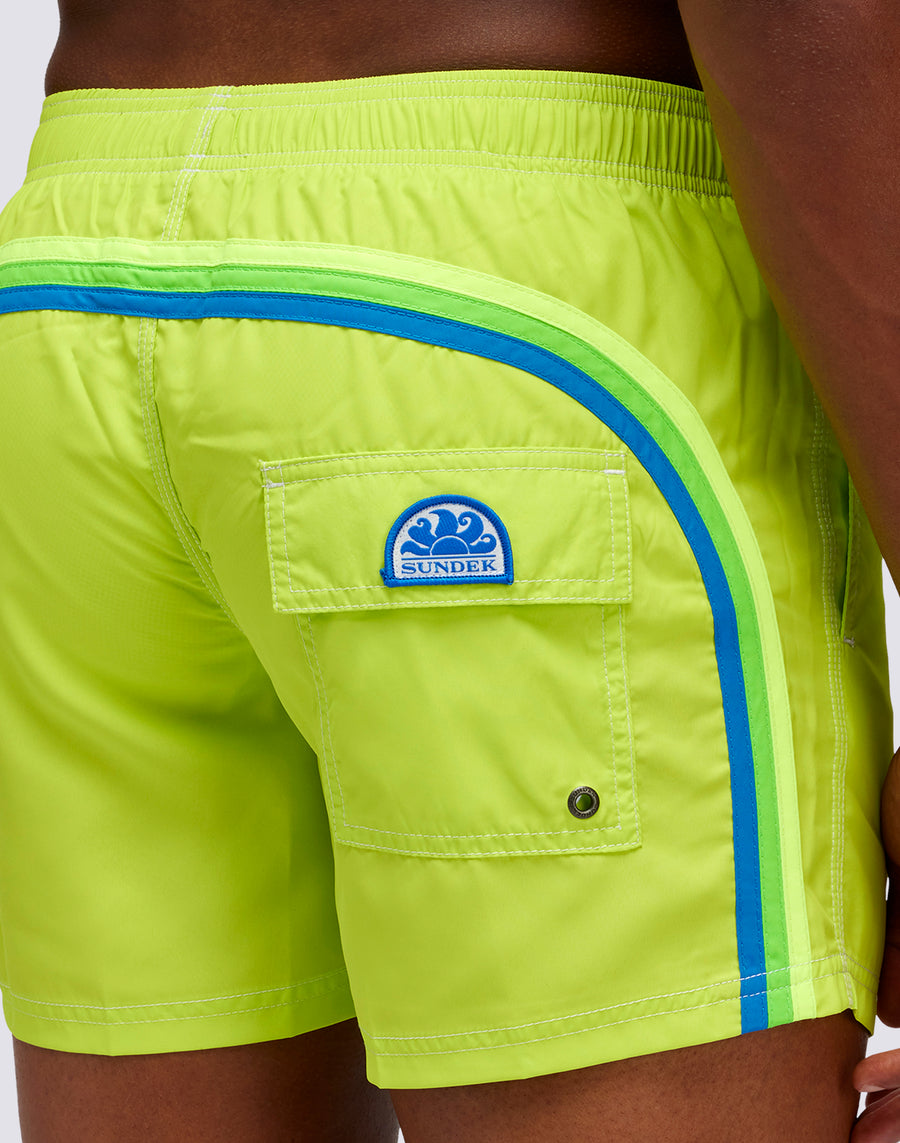 Short de bain pour homme en tissu recyclé Repreve, léger et à séchage rapide. Détail arc-en-ciel emblématique Sundek au dos. Longueur extérieure de la cuisse 14"/35 CM (en taille M).
