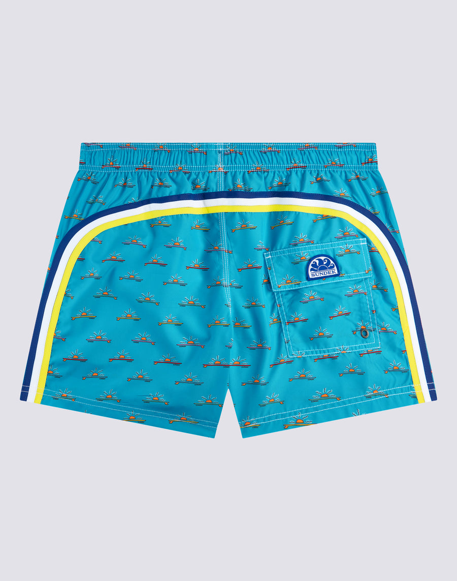 Short de bain avec cordon de serrage élastique à la taille, en tissu léger recyclé Repreve® fabriqué à partir de bouteilles en plastique. Détail arc-en-ciel emblématique au dos et Sun Board microprint. Couture extérieure 35 cm (taille m).