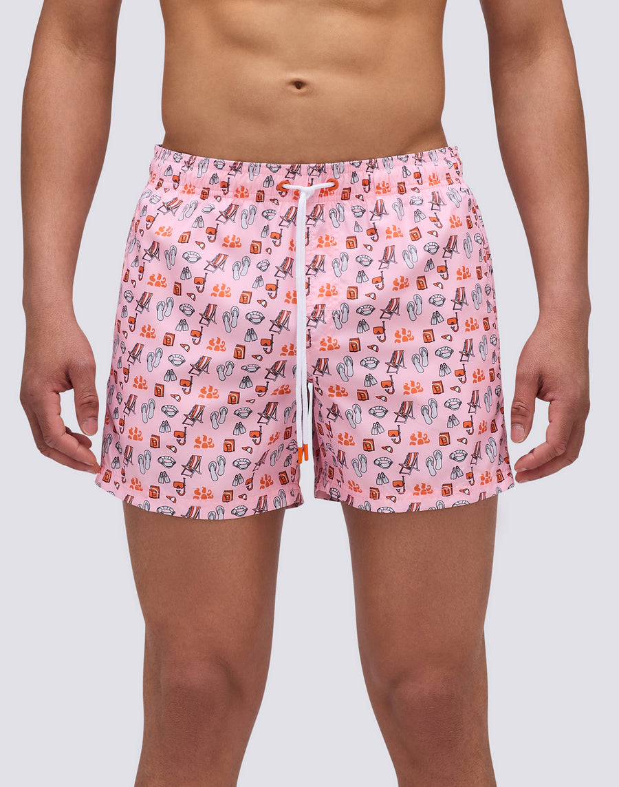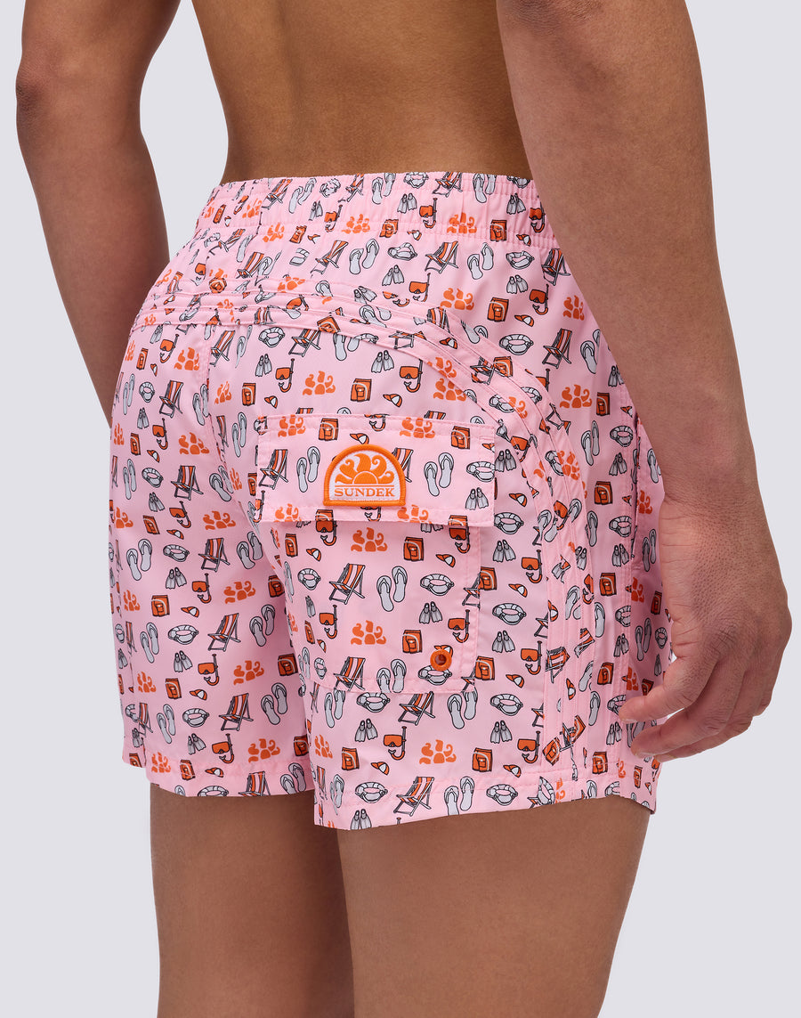 Maillot de bain avec cordon élastique à la taille, en tissu léger Repreve® recyclé à partir de bouteilles en plastique. Mini imprimé avec les indispensables pour la plage et le traditionnel arc-en-ciel Sundek ton sur ton dans le dos. Largeur extérieure de la cuisse 14"/35 cm (taille M).