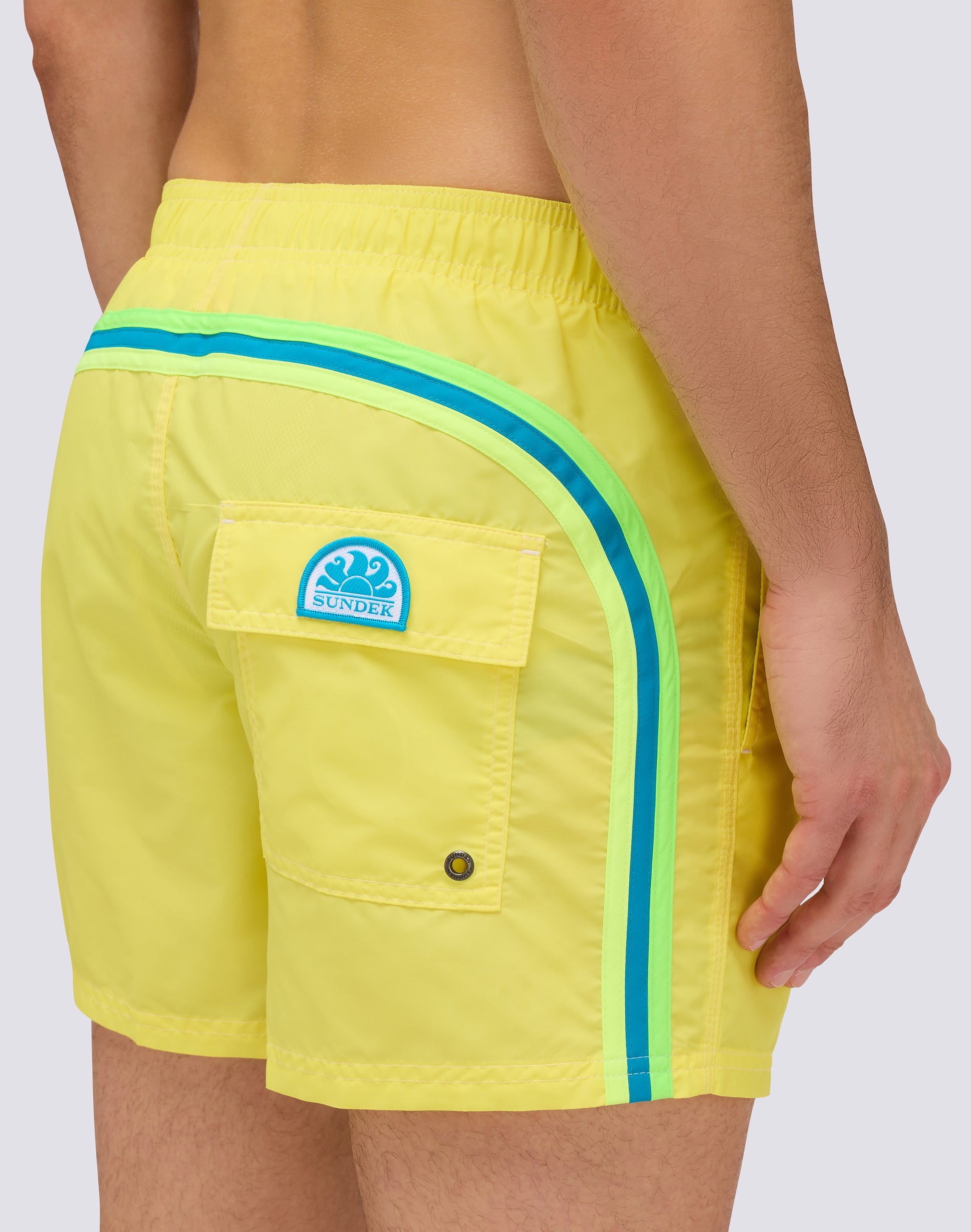 Le maillot de bain court pour homme M504BDTA100 incarne l'essence même du style Sundek : l'équilibre parfait entre un design emblématique, un confort absolu et la qualité. Ce short de bain à taille élastiquée est le compagnon idéal pour celles qui recherchent une liberté de mouvement, un séchage rapide et un style incomparable. Fabriqué à 100 % en nylon-taffetas, le tissu qui a fait la renommée de Sundek depuis 1958, ce maillot de bain offre une texture soyeuse au toucher, une légèreté exceptionnelle et une résistance extraordinaire. Son séchage ultra-rapide vous garantit un confort immédiat, tant dans les vagues qu'hors de l'eau, pour passer sans effort de la plage à l'apéritif. Caractérisé par l'arc-en-ciel Sundek unique au dos, symbole de l'authenticité et de l'héritage de la marque, ce short de bain présente une taille élastiquée avec cordon de serrage réglable pour un ajustement personnalisé. Les coutures à trois aiguilles garantissent une résistance et une durabilité maximales, même après d'innombrables sessions de surf, de natation et de bronzage. Polyvalent et performant, parfait pour le surf, la natation, le beach-volley et les loisirs, ce short de bain pour homme allie performances techniques et style décontracté. Sa longueur de 35 cm (en taille M) offre une coupe moderne et sportive, idéale pour ceux qui aiment la liberté de mouvement.