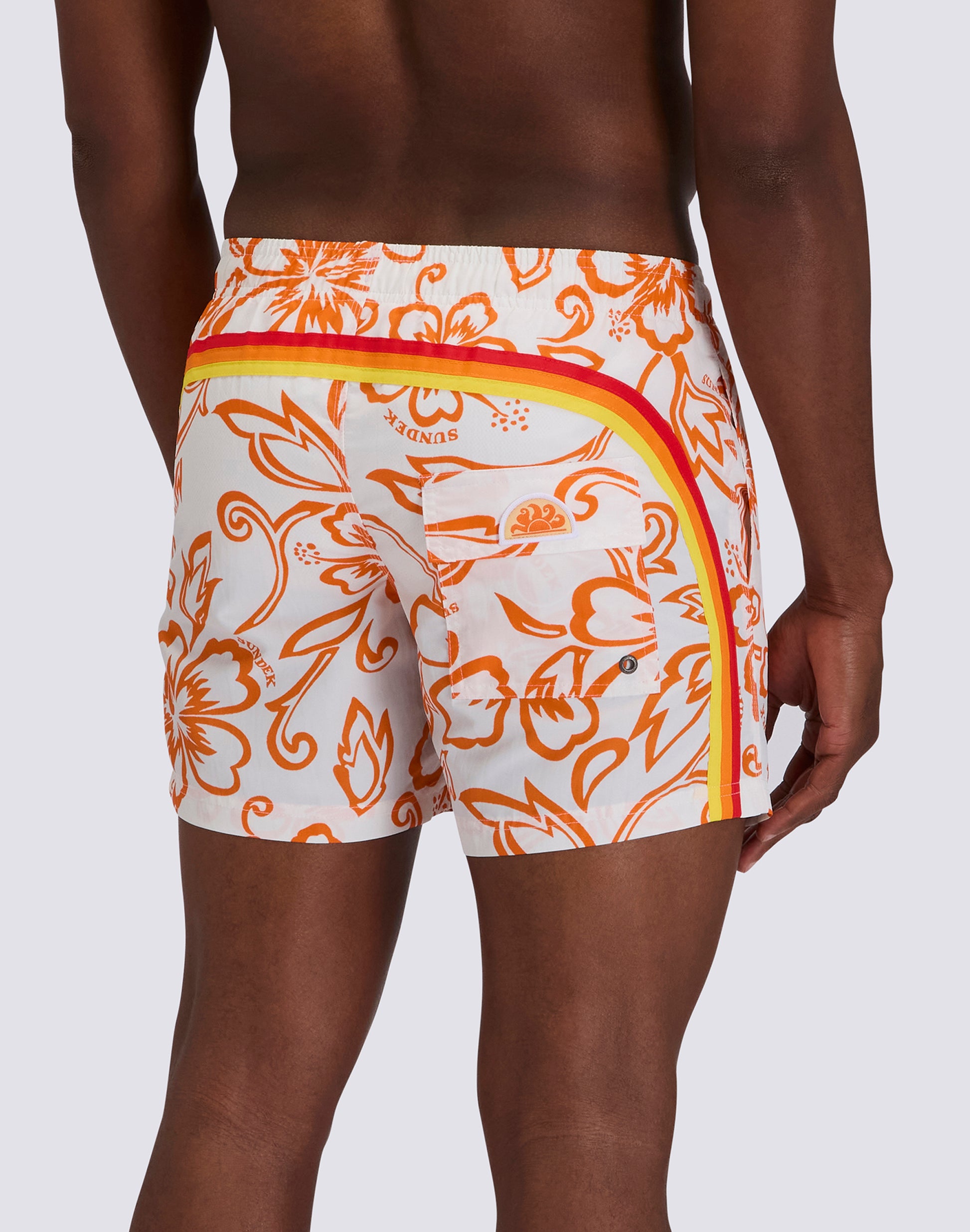 Le short imprimé Hibiscus Archive célèbre l'héritage Sundek avec un imprimé floral d'archive qui évoque les styles historiques du passé. Ce boardshort vintage pour homme, doté d'une taille élastique, arbore l'emblématique imprimé Hibiscus et un arc-en-ciel de couleurs d'archive, pour un look rétro-contemporain mêlant nostalgie et style. L'imprimé rend hommage aux modèles Sundek historiques qui ont marqué l'histoire du beachwear. Ce motif floral vintage met en scène des hibiscus stylisés. Un design qui retrace des décennies d'histoire de Sundek et célèbre l'esthétique tropicale de l'âge d'or du surf. Le détail arc-en-ciel au dos fait également référence aux couleurs d'archive, avec une palette vintage différente de l'arc-en-ciel classique. Cet élément distinctif complète le look patrimonial et atteste l'authenticité d'un style qui célèbre le passé tout en se tournant vers l'avenir.