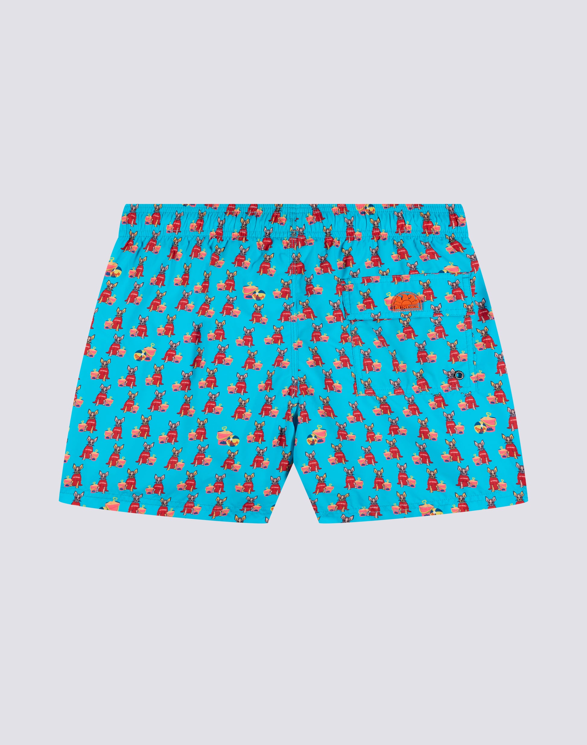 Maillot de bain pour homme de la collection capsule Pelo, dédiée aux amis à quatre pattes. Ce modèle « Lifeguard Chihuahua » présente la race de chien du même nom et est fabriqué à partir de polyester recyclé. Parfait pour les amoureux des chiens qui veulent un vêtement confortable, durable et au design unique pour les journées à la plage.