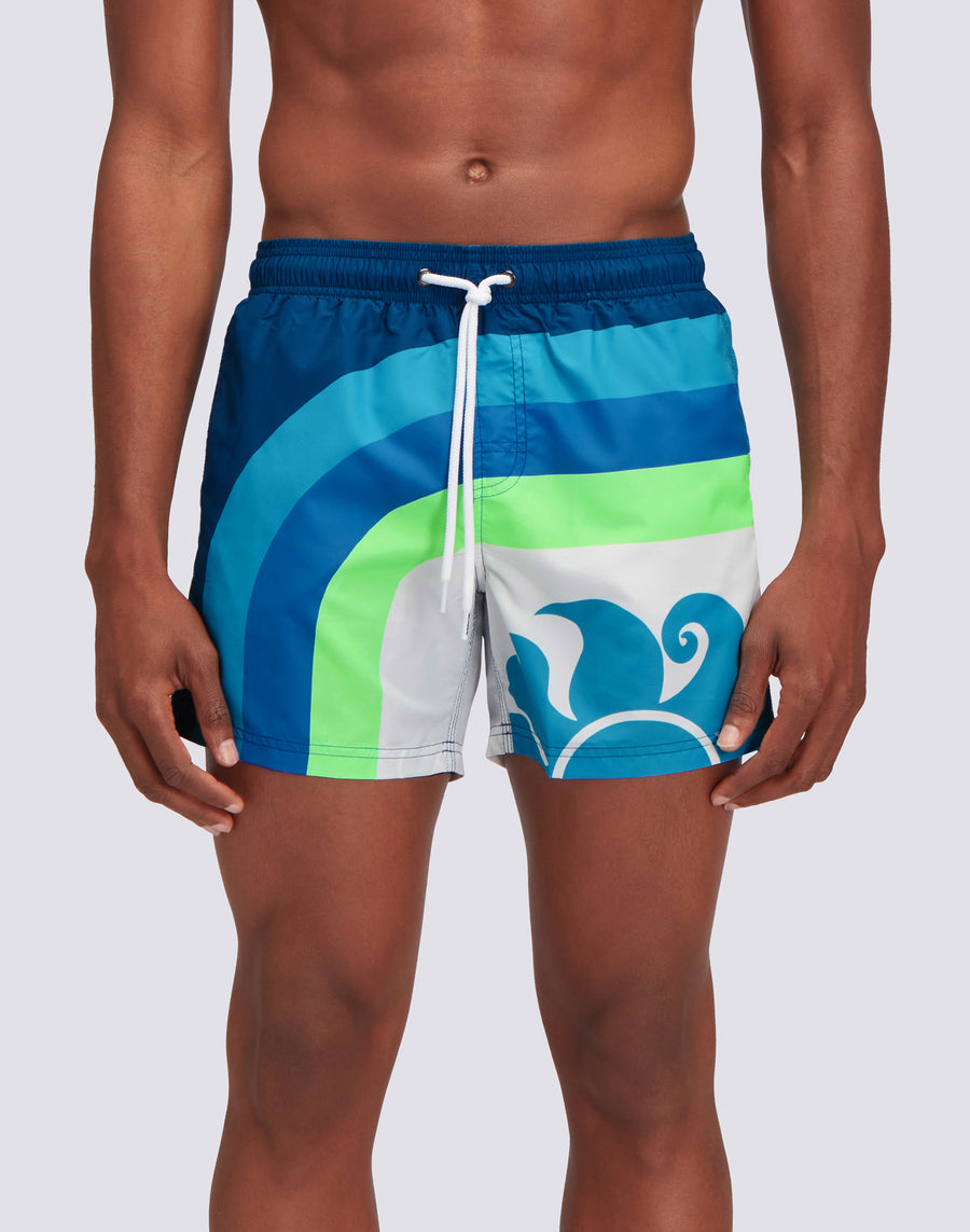 Maillot de bain pour homme avec cordon de serrage élastique à la taille, en tissu léger Repreve® recyclé à partir de bouteilles en plastique. Détail arc-en-ciel emblématique sur le dos. Sun colors imprimé. Longueur extérieure de la cuisse 35 cm (taille M).