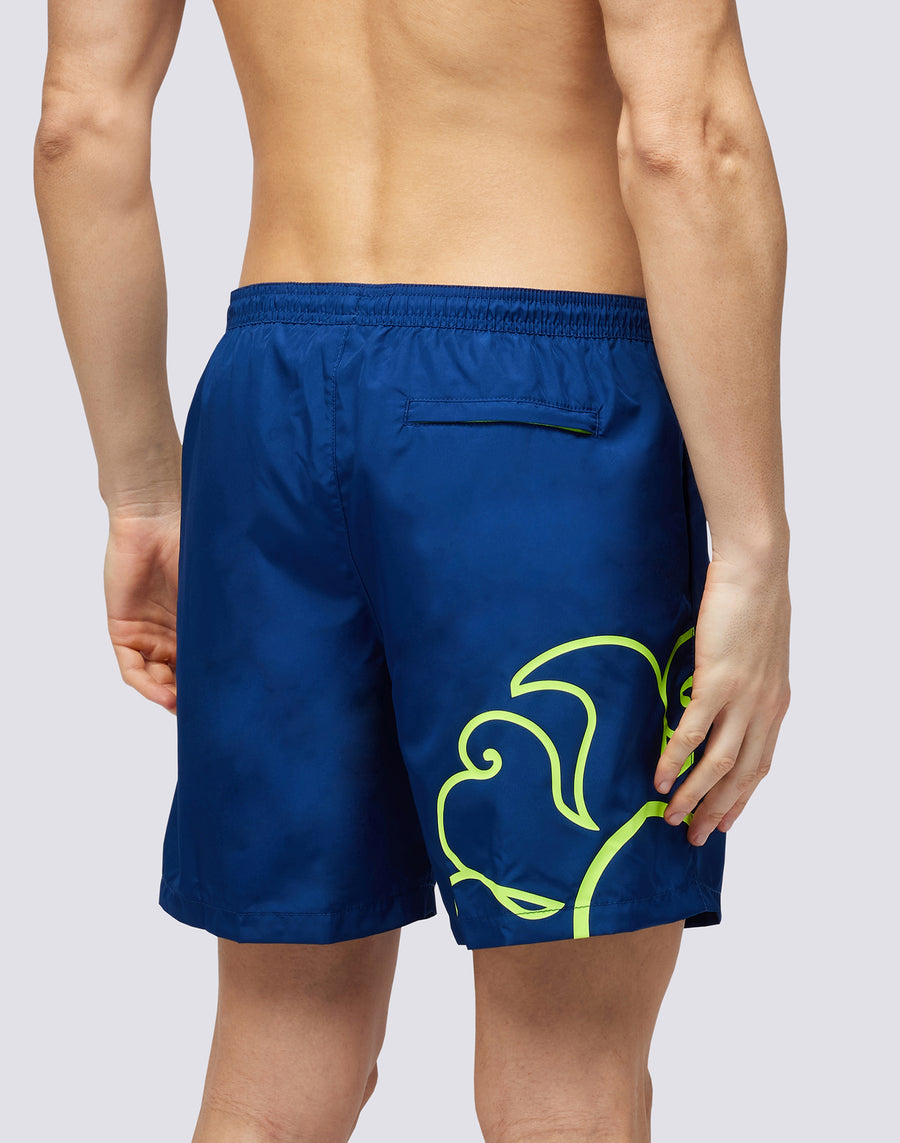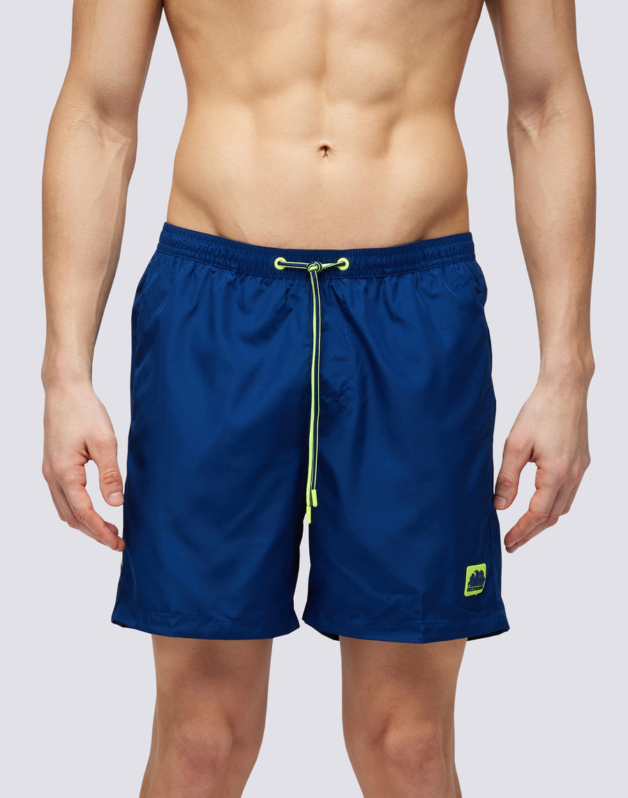 Short de bain pour homme, longueur moyenne, taille élastiquée. Equipé d'un cordon de serrage et d'une poche arrière zippée. Il sèche rapidement grâce au polyester léger avec lequel il est fabriqué. Longueur extérieure de la jambe 16"/41 cm (en taille M).