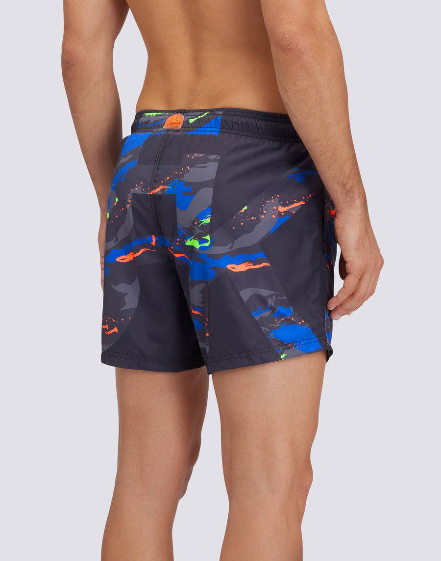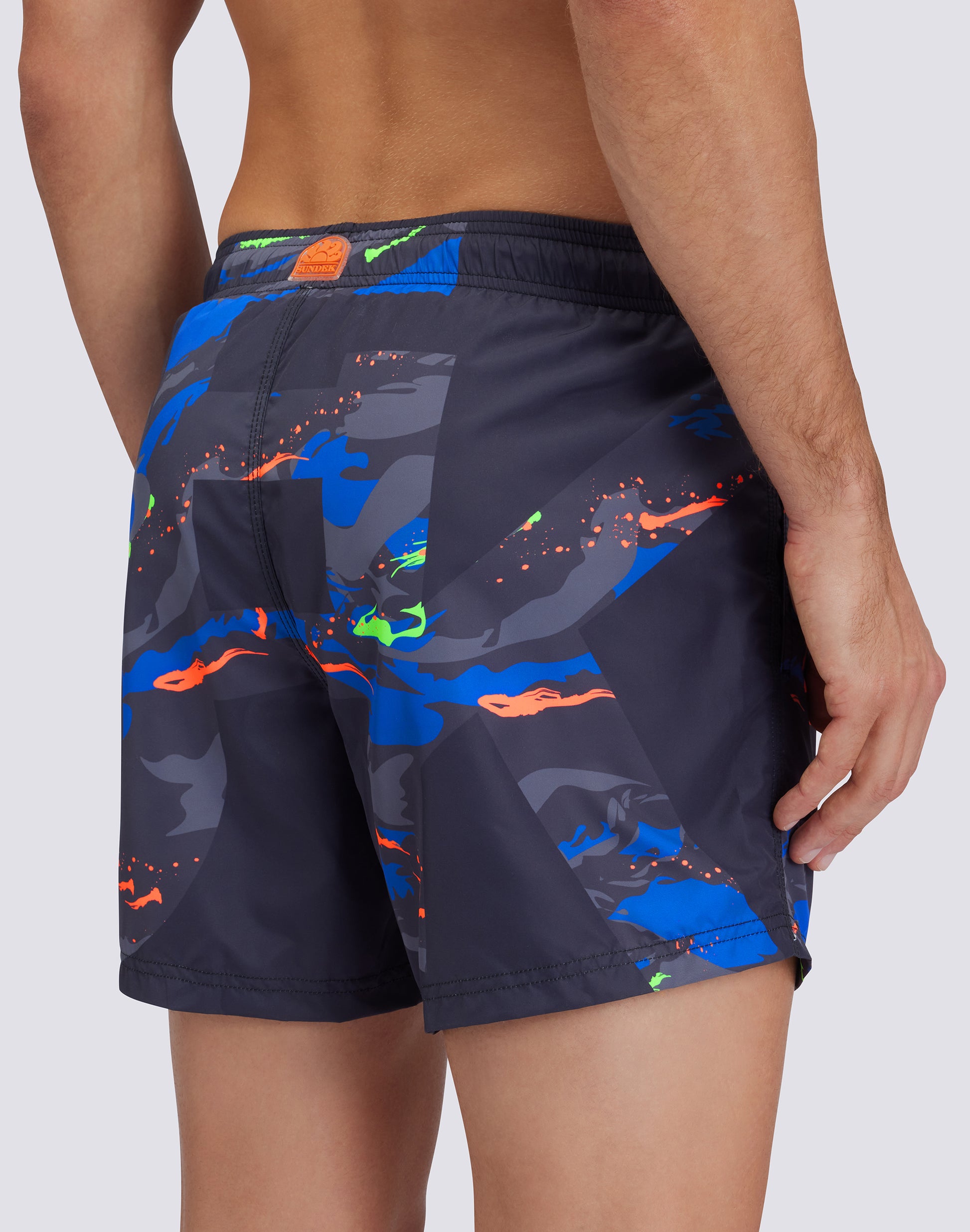Maillot de bain pour homme avec cordon de serrage élastique à la taille, en tissu léger Repreve® recyclé à partir de bouteilles en plastique. Détail arc-en-ciel emblématique sur le dos. Logo Macro imprimé. Longueur extérieure de la cuisse 35 cm (taille M).