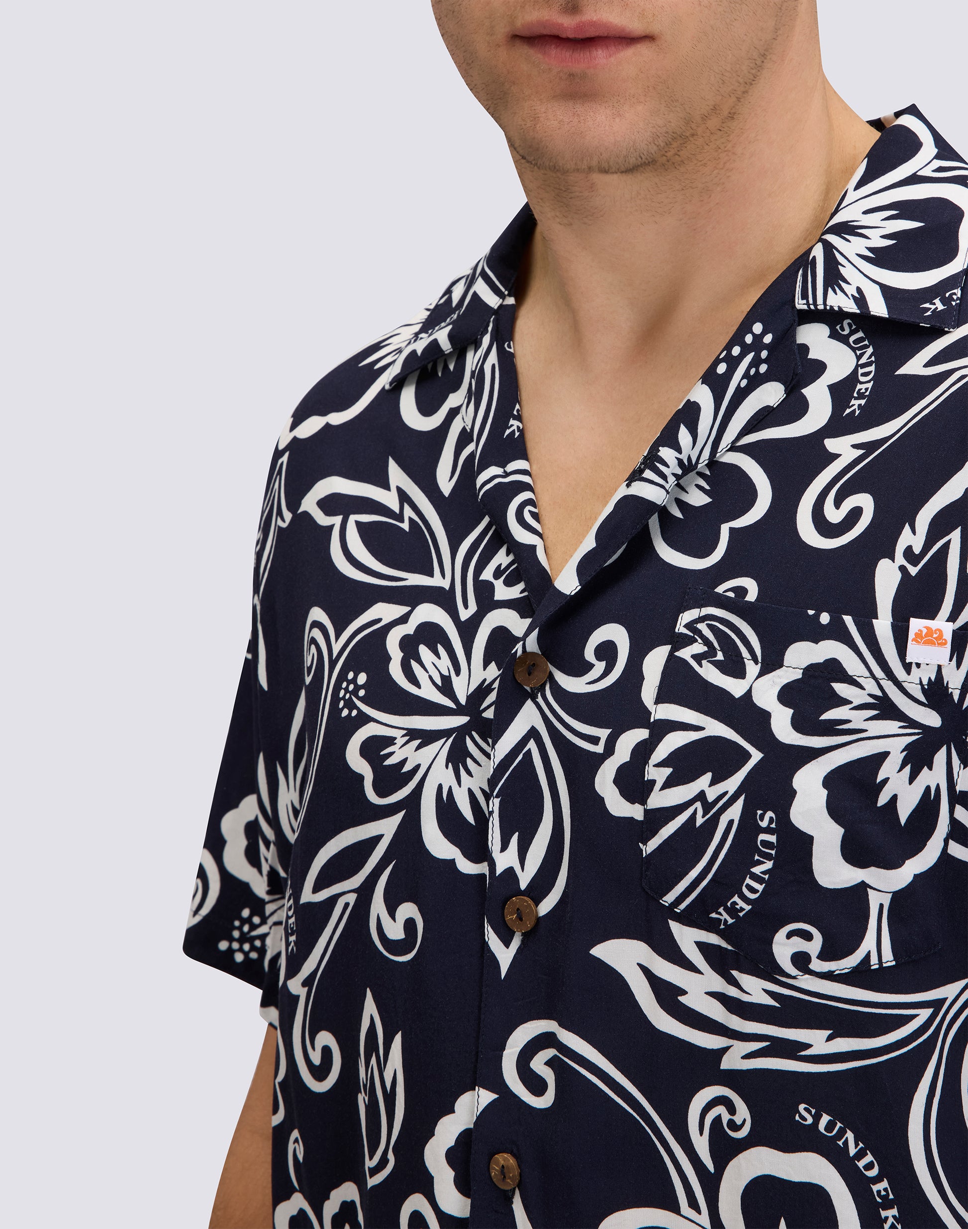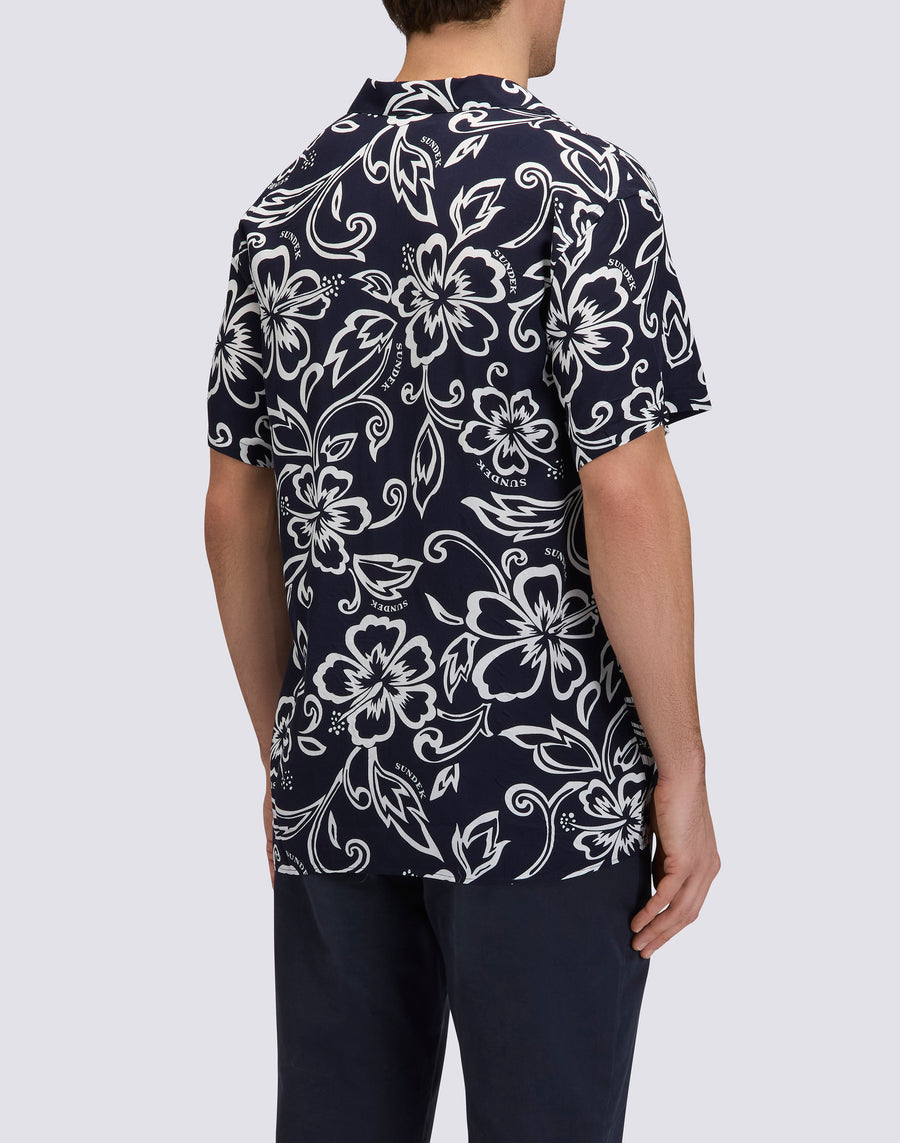 Chemise pour homme modèle bowling imprimée à manches courtes, en viscose popeline. Coupe décontractée.