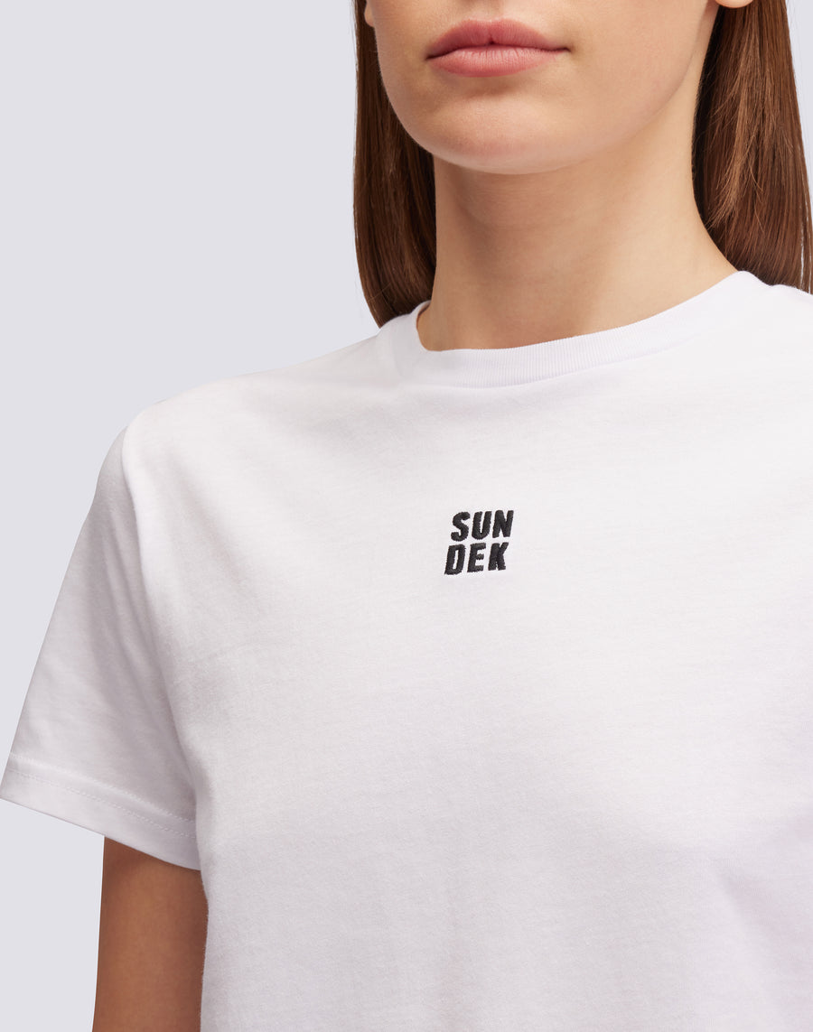 T-shirt femme avec une coupe crop et un style sportif, parfait pour des looks informels, à porter sur la plage par-dessus un maillot de bain, associé à un short ou pour des activités de plein air.