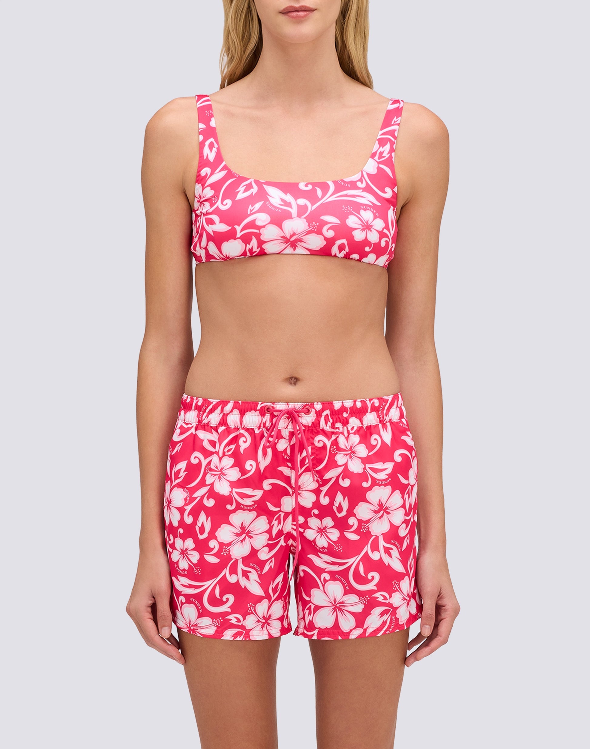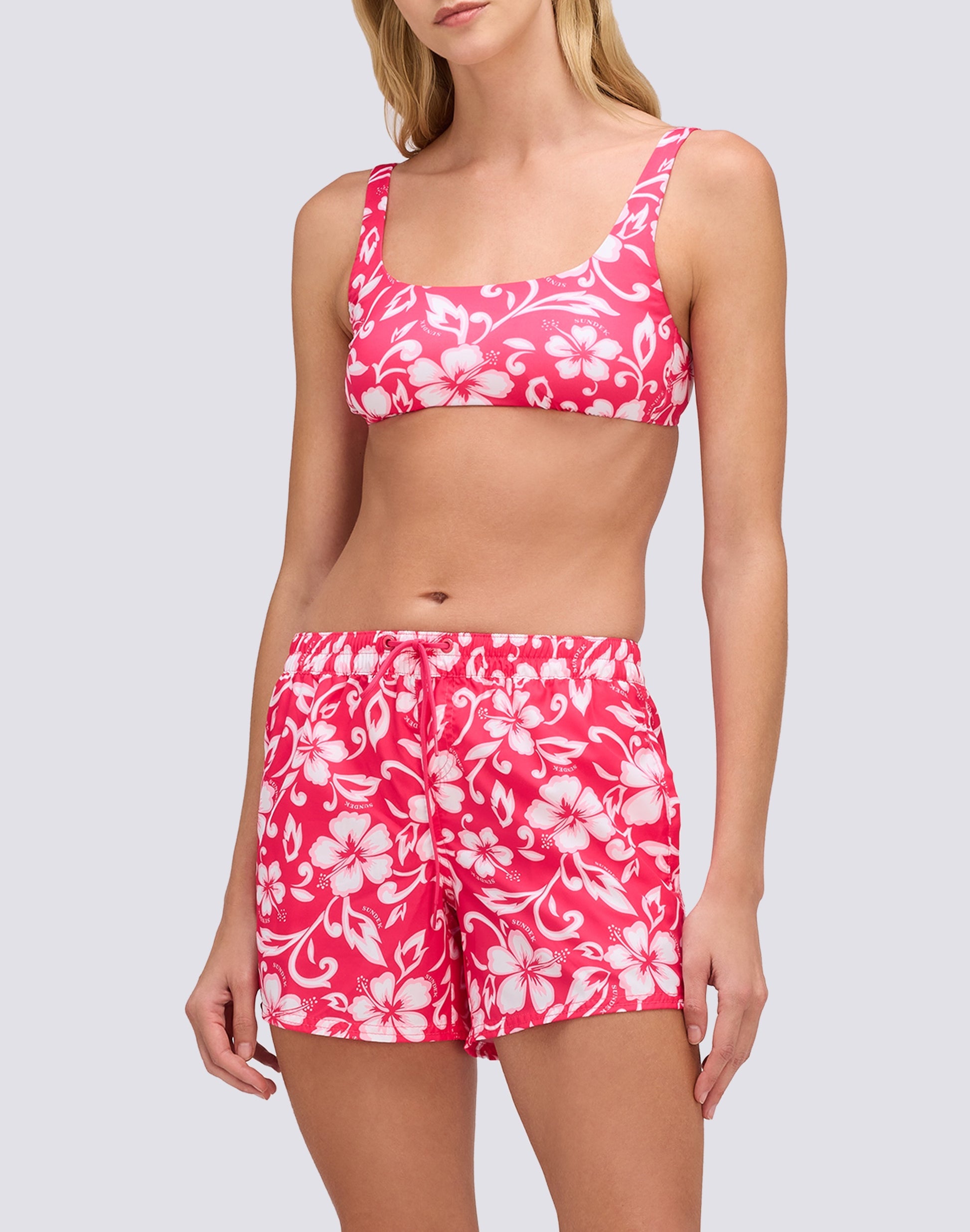 Prête à profiter de la mer avec le short de bain pour femme Coast, fabriqué en tissu recyclé Repreve®. L'imprimé iconique SK23 et l'ambiance florale vous offrent un look unique à arborer sous le soleil estival.