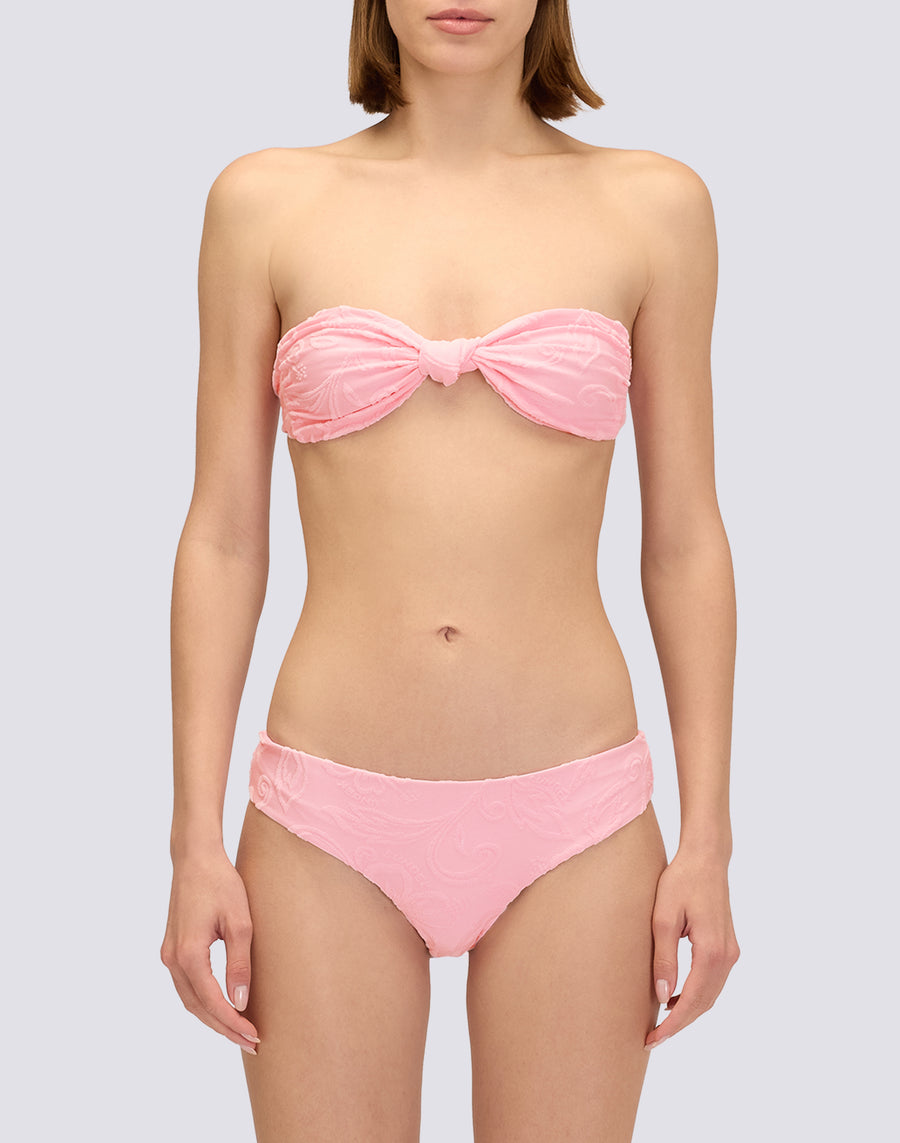 Le haut bandeau se caractérise par une bande de tissu qui enveloppe le buste sans bretelles. Il peut être droit, ajusté, avec ou sans fronces, et comporte souvent une fermeture à l'arrière avec des agrafes ou des lacets. L'absence de bretelles est idéale pour éviter les marques de bronzage sur les épaules. Il s'adapte à différents styles, du plus sportif au plus élégant, selon le tissu, le motif et les associations. Le bandeau est souvent idéal pour les poitrines petites ou moyennes, en particulier les modèles rembourrés ou froncés qui créent un effet optique de volume supplémentaire. Le bikini bandeau offre de multiples possibilités de combinaisons pour créer des looks de plage tendance. Vous pouvez également ajouter des colliers à plusieurs rangs ou des boucles d'oreilles pendantes pour une touche de style. C'est une option élégante et polyvalente pour la plage, idéale pour celles qui souhaitent un bronzage uniforme et aiment un style épuré.