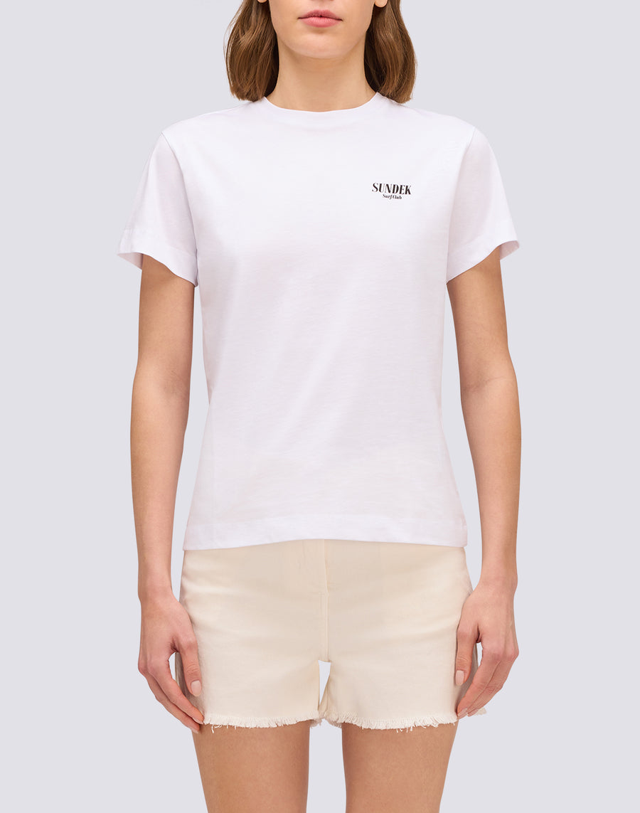 T-shirt femme à col rond souple avec imprimé d'éléments iconiques au dos et inscription SUNDEK imprimée sur le devant. Un vêtement basique et polyvalent à porter seul ou associé à d'autres pièces de la collection.